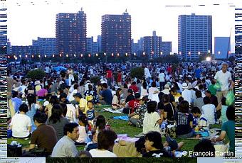 La semaine dernière nous avons été à un des ces fameux feux d'artifices (prêt de notre appartement) le long de la rivière Tama. C'était très impressionnant, surtout la quantité de personnes venues assister à cet événement, environ 100 000 personnes. C'était la première fois que je voyais des formes (bonhomme sourire, cœur etc.) faites avec des feux d'artifices. La finale était de toute beauté. Les feux durent en moyenne 1 h 30 minutes. On apporte brochettes, poissons panés, maki, bières et saké.... bien sûr :-)