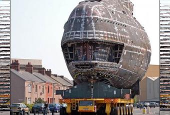 Une image assez rarissime, un sous marin nucléair Anglais classe Astute presque finalisé en train de traverser un quartier résidentiel.