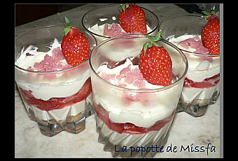 Dans les verrines, déposer un fond de biscuits imbibés, une couche de mousse, une couche de fraises et pour finir une couche de mousse.