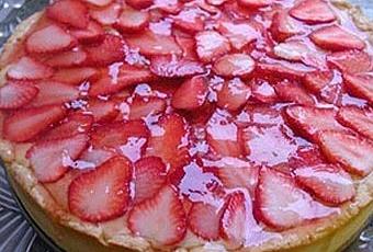 Déposez 350 g de pâte brisée dans un moule à tarte où vous éparpillerez 500 g de rhubarbe et les fraises en morceaux. Nappez ensuite les fruits de la crème à flan et faites cuire à 180° C pendant une treintaine de minutes.