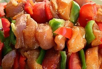 Sur des piques à brochettes alterner poulet, tomates poivrons et oignons de la marinade.