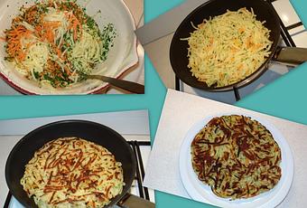 persil haché, 2 belles carottes râpées, 100gr de beurre 1/2sel fondu et 1CàS d'huile d'olive, sel et poivre. Éplucher les PDT râper les, dans un grand saladier mélanger avec les carottes, le persil, le beurre l'huile, assaisonner et disposer à plat dans votre poêle chaude, 3 mn de chaque coté, et bon appétit.