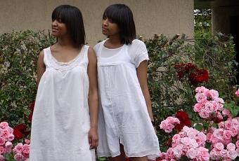 ♫♪Nous sommes deux soeurs jumelles nées sous le signe des Gémeaux, mi, fa, sol, la, mi, ré♫♪ et bien non je suis gémeaux oui mais elle est lion et surtout elle a 12 ans de moins que moi. Oh la la la la mais ça ne me rajeunis pas tout ça. La chaleur, une douce brise d’été, notre ami le soleil et nous voilà pour un duo de robes blanches jouant le contraste avec les roses.