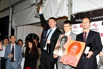 Le podium du M-Tel 2009 : 1er Shirov, 2ème Carlsen et 3ème Topalov © site officiel