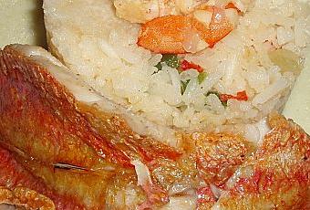 Dans un saladier, mettre le riz, couvrir largement d'eau chaude mais non bouillante, ajouter une pincée de sel et laisser tremper au moins 20 minutes. Peler à l'économe les poivrons et les couper en petits dés. Dans un faitout, mettre 2 CS d'huile et faire suer l'échalotte émincée, retirer la moitié et la garder en attente. Ajouter dans le faitout les dés de poivrons et les crevettes décortiquées et bien faire tout revenir. Laver le riz à l'eau froide dans plusieurs eaux jusqu'à ce qu'il n y ait plus de trace d'amidon. Mettre dans le faitout 2 verres et 1/2 d'eau, saler, poivrer et porter à ébullition, ajouter le riz bien lavé, le beurre, remuer, et laisser cuire à tout petit feu et à couvert jusqu'à absorption totale de l'eau (vérifier en plantant une cuillère au milieu, pousser légèrement pour s'assurer qu'il n y a plus de liquide). Eteindre et laisser reposer à couvert sans remuer entre 10 et 15 minutes. Dans une sauteuse, faire cuire les filets de rouget préalablement salés, poivrés et farinés, côté peau quelques minutes, tourner-les et éteindre aussitôt dessous. Dans des assiettes, dresser le riz et présenter les filets à côté.