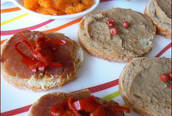 J'ai reçu il y a quelques temps un petit pot en forme de champignon qui contenait une mousse de cèpes à la truffe blanche, venant du site Hispania Delicatessen. C'est aussi addictif que le pesto de pistaches, et pour éviter de le manger toute seule à la p'tite cuillère pour profiter de tous ces parfums, j'en ai tartiné des rondelles de baguettes et j'ai ajouté des baies roses dessus. c'est aussi extra en y ajoutant dessus une p'tite lamelle de magret de canard séché !