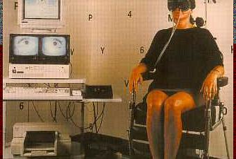 m'a coiffée d'un gros casque à caméras avec caches pour les yeux. Le cache de l'oeil gauche ouvert, je devais suivre du regard sur un écran sur le mur d'en face un petit carré blanc qui bougeait.