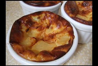 Egouttez les poires et coupez-les en gros dés. Beurrez 3 ramequins, disposez les dés de poires et deux caramels mous au centre. Versez dessus la préparation à base de lait.