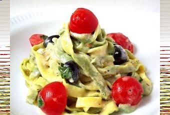 Fettucine bicolori al caprino, pomodorini, olive e erbe marinati (per 4 persone)