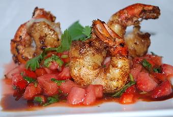 mettre de la salsa dans les assiettes et les gambas dessus, parsemer quelques gouttes de vinaigre balsamique