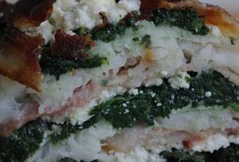 superposez le cabillaud, les épinards, la brousse et la poitrine fumée en salant et poivrant