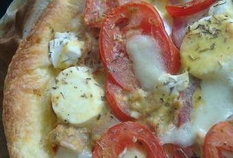Quand la pâte est prête : étalez y les tomates, puis le thon, et le chèvre. Versez l'appareil, saupoudrez d’herbes de Provence.