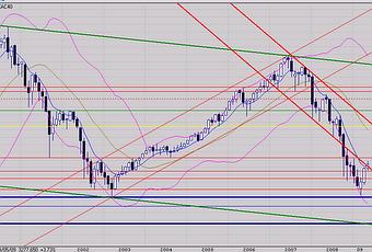 La première constatation à partir du graphe mensuel, est que la bougie du mois de mai a réintégré le canal baissier démarré à la mi 2007.Cette bougie blanche est de petite taille et elle correspond à la période de correction en cours depuis pratiquement début mai. Ce qui est intéressant de noter, c'est que cette bougie est à peine revenue dans le corps de la grande bougie blanche précédente. Cela confirme combien le courant vendeur potentiel a du mal à s'exprimer en ce moment.