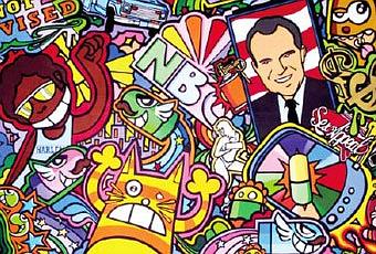 un monde entre noir et blanc qu'il cristallise en aplats de couleurs vives. Car tout inspire le Kanibal du design d'une planche de skate, à la photo d'une jolie fille dans un magazine, en passant par une boite de cacahuètes Thaïlandaises.
