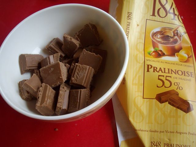 - Beurrer et fariner le moule. Faire fondre la Pralinoise au bain-marie (ou micro-ondes : plus rapide, moins chiant et le résultat et le même, en remuant bien à la fin). Réserver. Mélanger la farine avec la poudre de noisettes, la maïzena et le bicarbonate.