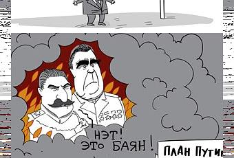 A la lecture du panneau où il est écrit "le Plan Poutine, c'est la victoire de la Russie", le Monsieur à lunettes s'exclame "C'est du culte de la personnalité". Staline et Brejnev apparaissent alors directement de l'Enfer et disent : "Non ! C'est une vieille histoire dont on nous bassine les oreilles."
