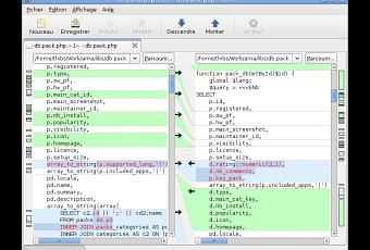 Meld est un outil de comparaison visuel et de fusion de fichiers puissant. Il montre les différences entre 3 fichiers maximum avec des code couleurs et vous permet de fusionner ou d’éditer les fichiers comparés.