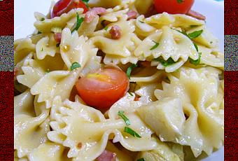 Faire cuire les fonds d’artichauts le temps indiqué sur le sachet. Egouttez les et coupez les en cubes. Faire cuire les pâtes al dente dans une eau bouillante salée. Dans une poêle sans matière grasse, faire dorer les lardons, égouttez les. Dans un saladier, mettez l’huile d’olive, le vinaigre, les artichauts, les tomates cerises coupées en deux, l’oignon émincé et les lardons. Salez, poivrez et remuez. Une fois les pâtes cuitent, égouttez les et placez les dans le saladier, mélangez, ajoutez le basilic ciselé et servez.