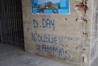 La pointe du Grouin (Cancale) le fait à sa manière, avec une petite exposition et surtout ce tag contemporain "N'oublier jammais", peint à la bombe sur le mur d'un blockhaus.