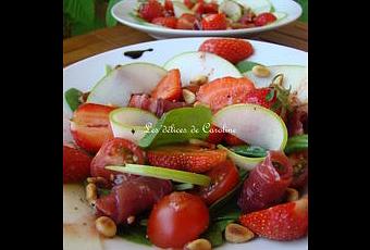 Fraises, tomates cerises, pomme granny, magret et pignons de pin grillés et croquants composent cette salade méli mélo!
