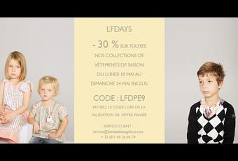Jusqu'au 24 mai inclus, - 30% sur toutes les collections de vêtements de saison avec le code LFDPE9 sur Little Fashion Gallery