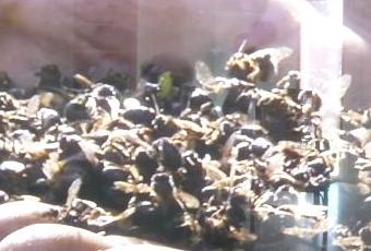 Photo prise au cours d'une émission télévisée sur la disparition des colonies d'abeilles.Ce message se suffit à lui-même : « Hier après-midi, les champs derrière chez nous ont été traités : c'est par poignées que nous avons ramassé des abeilles complètement groggy, incapables de voler et qui ont toutes fini par crever. Une vraie saloperie ! » A et E.