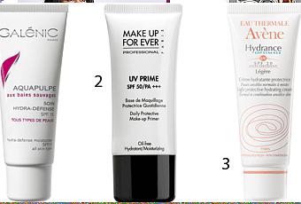 (1) Soin hydra-défense SPF 15, Aquapulpe, Galénic, 13.50 euros. (2) Base protectrice SPF 50, UV Prime, Make up for ever, 25 euros. (3) Hydrance optimale UV légère, Avène, 18.50 euros.