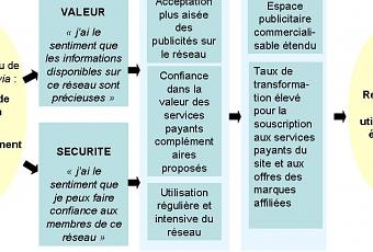 Mais alors, d’où vient la propension si élevée des membres Mixi à accepter la présence des publicités et à souscrire aux offres payantes de Mixi et de ses partenaires ? En fait, l’explication réside probablement dans le haut degré de fermeture de ce réseau. Pour synthétiser les possibles liens de corrélation entre ces deux faits, et parce qu’un petit schéma vaut mieux qu’un long discours, nous avons fabriqué celui-ci (il reprend notamment des éléments évoqués dans le billet “Mixi : le réseau social du futur ?”) :