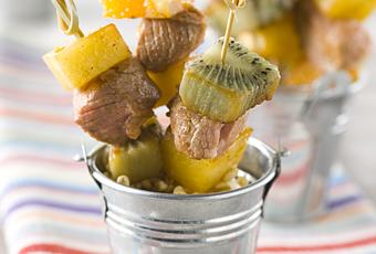 Déroulé : Monter les brochettes en intercalant les dés d'agneau et de fruits. Cuire à feu vif à la poêle ou au barbecue avec un filet d'huile d'olive. Assaisonner. En fin de cuisson, verser un filet de vinaigre balsamique. Remuer et déguster accompagné d'une salade.