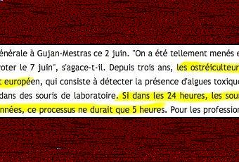 … mais bon, tant pis. Je voulais juste une petite info de plus sur ce fameux test à la souris qui empêche les producteurs arcachonais de vendre leurs huîtres, et je tombe sur ça :