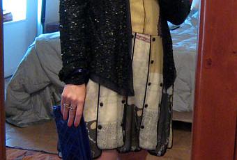 Robe Heimstone Aramis, gilet sequins La Redoute, pochette Becksondergaard, collier Alice Hubert, escarpins Steve Madden.