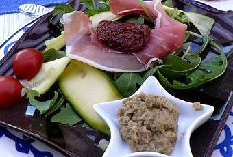 elle est faite de caviar d'aubergine (dans l'étoile), accompagné de jambon cru, courgettes en lanières, tomates cerise, tomate séchée, salade verte