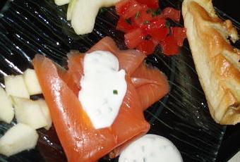 Disposer 2 tranches de saumon sur l'assiette, ainsi que la pomme coupée en tranches.