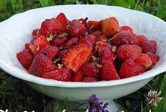 Préparer une barquette de fraises avec 1 càs de vinaigre à la pulpe de fraise, 2 càs de sucre (ou plus selon vos goûts). Parsemer de fleurs, c'est un mélange appelé "Samba" que j'ai acheté à Paris chez Izraël...je ne connais pas la composition (seule critique pour ce superbe magasin....il n'y a que le nom sur le paquet) mais il y quelques fruits rouges et des pétales de violette.