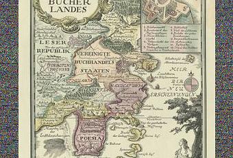 En substance le texte explique que cette carte est l'œuvre d'un illustrateur allemand, Alphons Woelfle, & qu'elle représente l'étendue & les divisions du BücherLandes (le Pays des Livres). Comme on peut le voir la carte est constituée d'une demi douzaine de territoires dont la plupart sont distinctement nommés: Leserrepublik (le République des Lecteurs), Vereinigte Buchlandelsstaaten (les États-Unis des Libraires), Recensentia (une sorte de Royaume de la Critique), Makalaturia (le Pays de la Page Blanche... pour les fans de poésie US: les Terres Vaines), la capitale de ce continent de l'imaginaire, dont Manguel s'est allègrement passé, se nomme Officina que l'on pourrait traduire par l'Officine, le Bureau ou, plus vraisemblablement (vu la petite « polémique » que l'on retrouve dans les commentaires) par: l'Atelier (sous entendu celui de l'imprimeur). Derrière ces grandes lignes se cachent quelques subtilités géographiques plutôt intéressantes comme le Volksausgabenteich, le Lac des Éditions Populaire (juste en dessous à droite de l'enluminure de la carte), ou le Schloß Platitüde, Château des Lieu-Commun (en bas à gauche, pas très loin du Gemein Plätze, le Terrain d'Entente)... le pays de la Poésie (Poesia) qui est une presqu'île (presque isolée mais pas tout à fait) dont la forme est celle d'une harpe. On y voit aussi une Mer des Nouvelles Parutions (Meer der Neu Erschetnungen), une mine de de la Littérature Dégénérée (Asphaltliteratur Bergwerke) placée dans la République des Lecteurs mais à la frontière avec la Province Interdite (au milieu à l'extrême gauche – hum...) etc etc... les germanophones vont se régaler.