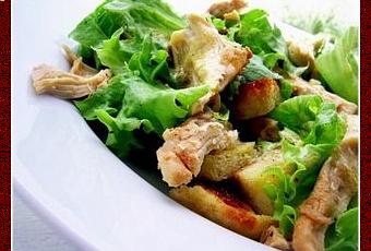 Eliminer les os et la peau du poulet. Effiler grossièrement la chair. Ajouter les morceaux de poulet à la salade.