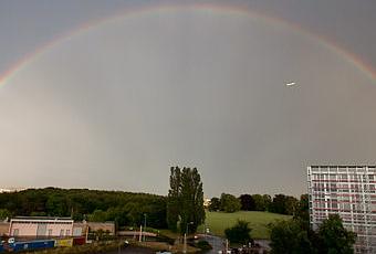 Il n’y pas que les concerts mais aussi les phénomènes météorologiques ! Mardi soir, le ciel de Meyrin à Genève était paré d’un magnifique double arc-en-ciel. Aujourd’hui plusieurs photographes genevois avaient publiés des photos de ce phénomène sur le net. A l’intérieur de l’arc, ce n’est pas une tache de poussière de mon capteur mais un avion en phase de décollage.