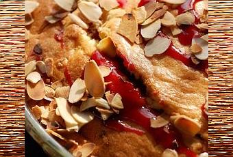 Quand le gâteau est à point répartissez alternativement la gelée et les amandes grillées. Servez de suite encore tiède, fondant et croustillant...