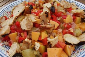 Faire griller les escalopes de poulet jusqu'à ce qu'elles soient bien cuites à l'intérieur. Saler, poivrer puis réserver dans une assiette, enveloppé de papier aluminium. Épépiner le poivron rouge, le peler avec un rasoir à légumes, et le couper en petits cubes. Couper la chair de la mangue en petits cubes (j'ai utilisé pour l'occasion un coupe mangue bien pratique