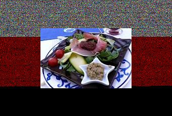 Pour l’entrée une salade composée avec légumes, crudités, jambon cru et caviar d’aubergine. Très rafraîchissant et léger.