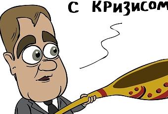 Sergueï Elkin a dessiné cette caricature de Dmitri Medvedev tenant une énorme cuillère et disant : "Vraiment, des moyens inépuisables de lutte contre la crise", car mercredi dernier, il s'est vu offrir la plus grosse cuillère en bois peinte au monde, fabriquée par Khokhlomski Khoudojnik. Selon les créateurs de cette cuillère géante (2 mètres pour 15 kilos), celle-ci pourrait devenir l'outil indispensable dans la lutte contre la crise financière. Ils espèrent en tout cas que ce cadeau portera chance à Medvedev.