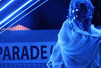 la fanfare Flottante ULIK ET LE SNOB9 personnages à l'allure impressionnante, dotés de chapeaux enflammés