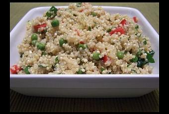 Eplucher et hacher finement l’échalote. Equeuter, épépiner et découper en petits morceaux le piment vert. Equeuter, épépiner et couper en petits morceaux le poivron rouge. Dissoudre le cube de légumes dans 500ml d’eau bouillante. Mettre à chauffer 1 c. à s. d’huile d’olive dans une casserole large. Y faire revenir l’échalote et le piment vert 2min. sans colorer. Ajouter le quinoa rincée sous l’eau froide et le bouillon de légumes. Porter à ébullition, couvrir et cuire 15min. à feu modéré. Ajouter les morceaux de poivron rouge et les petits pois. Remuer et poursuivre la cuisson 5min. Retirer du feu. Ajouter le gingembre râpé finement et l’ail écrasé au mortier. Mélanger. Couvrir et laisser tiédir. Ajouter le persil plat haché, la menthe finement ciselée, la ciboulette hachée, le jus de citron et 2 c. à s. d’huile d’olive. Saler et poivrer en vérifier l’assaisonnement. Servir tiède ou frais.