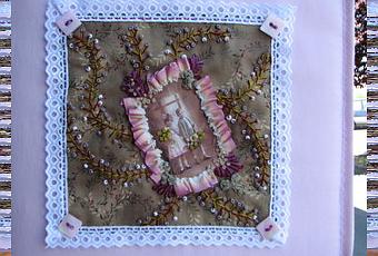 J'ai choisi de monter la broderie sur un tissus rose. J'ai ajouté quelques perles blanches et de la dentelle pour une finition romantique.