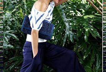 Pour preuve ? Mango nous propose deux tenues dans sa collection "Garden Secret" pour l'été 2009 :Dans un premier temps, l'esprit marin ressort de cette première tenue avec un t-shirt à rayures marines (12€), complété d'un pantalon large (39€), le tout accessorisé par un sac (35€) et des chaussures parme (69€). Une tenue marine pour une valeur donc de 155€.