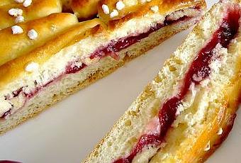 Et hop, encore une brioche tressée! Après une version abricot et poire, voici la version cerise: c'est inattendu mais excellent. La recette de la brioche et le façonnage de la pâte sont toujours les même.Quant à la compoté de cerise, c'est déjà celle utilisée pour le cheesecake et les pies.