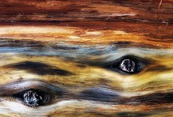 J’ai photographié une buche de cèdre après lui avoir enlevé l'écorce. Puis j'ai fait une rotation de l’image de 90º. On voit un visage dans cette photo, ou plutôt un masque avec un strabisme évident dans les yeux.
