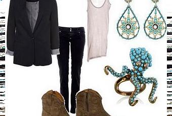 boyfriend blazer Topshop, skinny noir Cycle, boots Sandro, BO chandeliers turquoises Max and Chloe, bague octopuss turquoise Kenneth Jay Lane