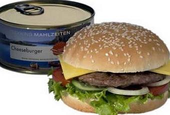 La première est une conserve de cheeseburger. Elle provient de Suède et déjà qu'il est difficile d'imaginer un hamburger en boîte, ca l'est encore plus quand on pense que cette petite boîte traverse l'océan pendant pas mal de temps ! De plus, elle coûte 4 euros, soit le prix d'un hamburger "frais" et d'une portion de frites dans la plupart des fast food.