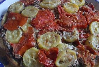 Huiler un moule à tarte. Disposer les tomates, puis les courgettes. Etaler la moitié du mélanger de fromage. Disposer alors les aubergines et les poivrons et terminer avec le reste de fromage.